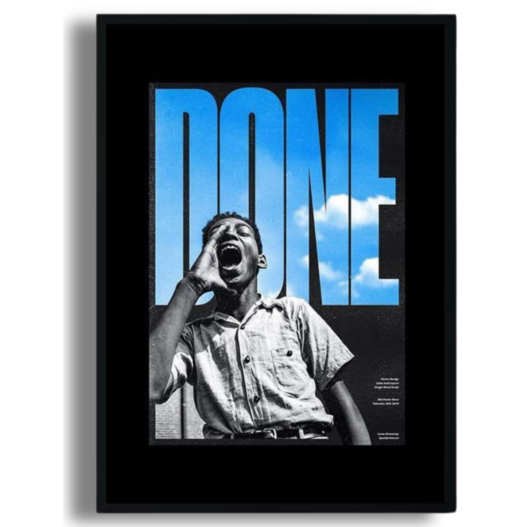 Art that speaks. Done fuses vintage photography with sky typography — symbolizing breakthrough, freedom, and completion.
