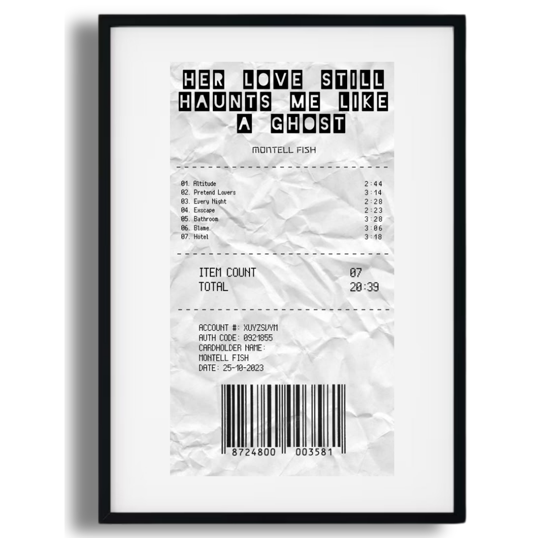Hauntingly beautiful. This print channels Montell Fish’s soul and vulnerability through minimalist typography and crumpled receipt texture — for walls that speak emotion.
